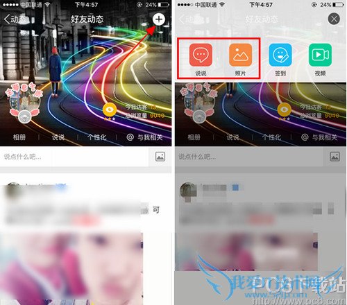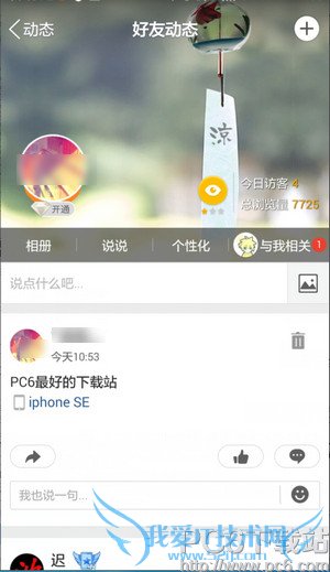 3、再接下来返回到好友动态界面,点击右上角的【+】按钮,选择“说说”或者【照片】,在这里PC6小编选择说说选项,如下图所示。