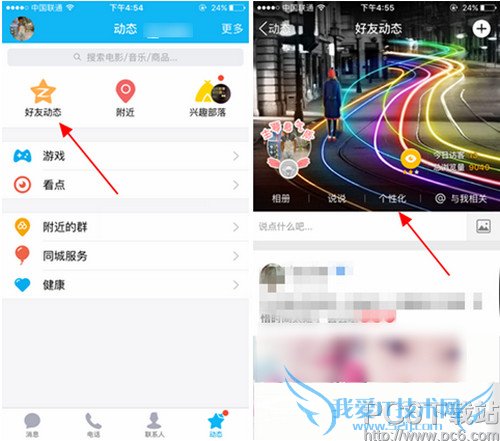 1、打开手机qq进入左下角动态界面,点击进入到【好友动态】页面,进来之后在选项当中点击一下【个性化】如下图所示。