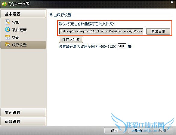 2、选择“基本设置”中的“缓存设置”,可以看到歌曲缓存保存的路径,同时您也可以点击“更改目录”进行更改,并且设置缓存的最大占用空间。