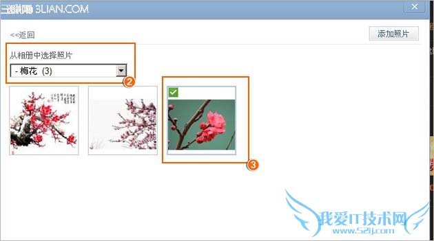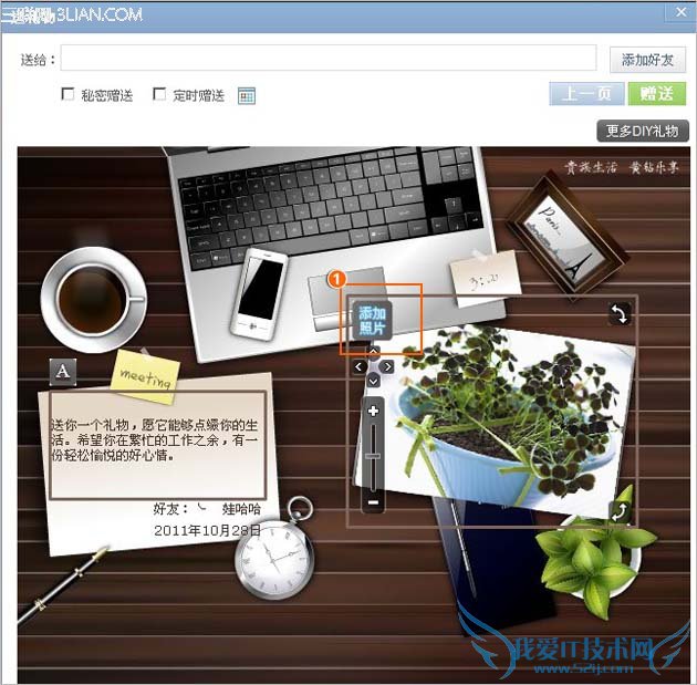 进入正式的DIY页面后,首先得选择需要使用DIY的照片(必须从空间相册中选择)。单击“添加照片”后,这时候会有一个“送礼物”选框弹出,我们可以从相册中选出照片。