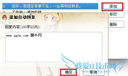 3、在弹出的对话框中选择添加,然后输入你需要的话,点击确认就设置好了。