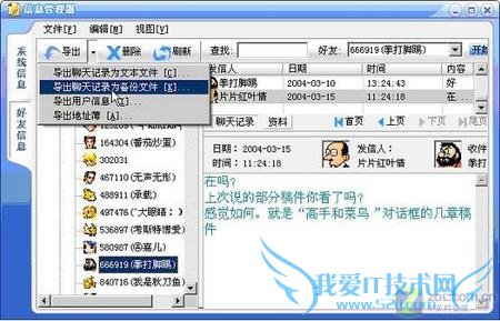 (2)打开消息管理器后,先单击“我的好友”按钮,然后单击“我的好友”树型按钮,在出现的 好友列表中选择其中需要备份资料的好友,然后单击工具栏上的“导出”图标,选择“导出聊天记录为备份文件”命令(如图2),弹出“另存为”对话框,选择好 目标文件夹,输入备份文件名,单击“保存”按钮,导出完毕(如图3)。