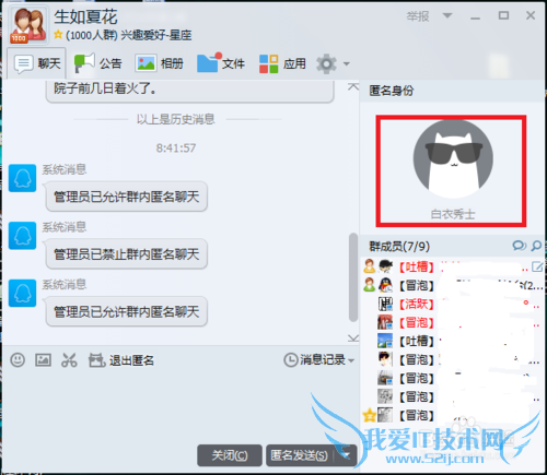 这时候我们在聊天框里随便打点字,点击匿名发送,就不显示你的群名称了,而是以白衣秀士的名称发出。