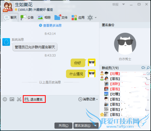 点击退出匿名,可以退出匿名模式,回到正常群聊天模式。