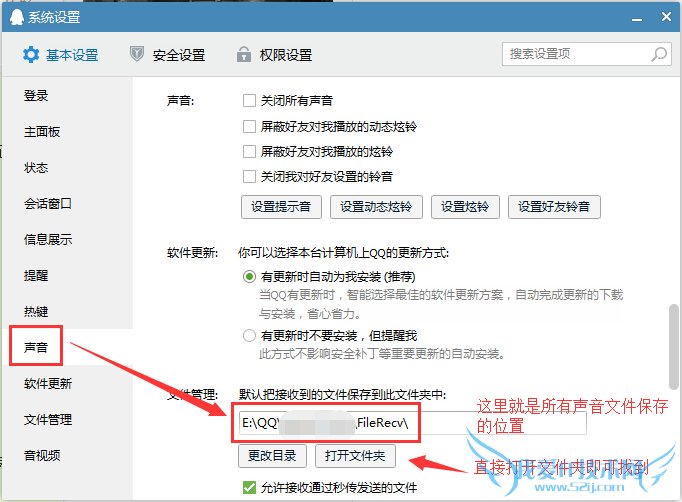 2.再找到声音--右边可以看到声音文件保存的目录。直接点打开文件夹,然后找到与自已qq号同名的文件夹,再在此文件夹里面找到Audio即可。