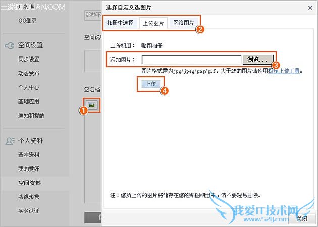 注:若您签名档中没有图片按钮(插入图片),这种情况可能是由于您的空间活跃程度不够导致。请您尽快多丰富您的空间内容,并多与好友互动(如评论回复好友、留言等等),一段时间之后就可以正常上传图片的。