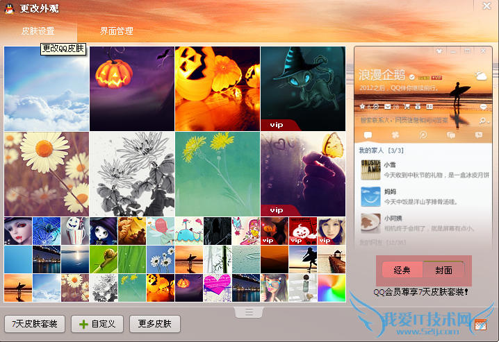 就会一个更换QQ皮肤的页面,在最右边有两个选项一个是主题,一个是封面选项。