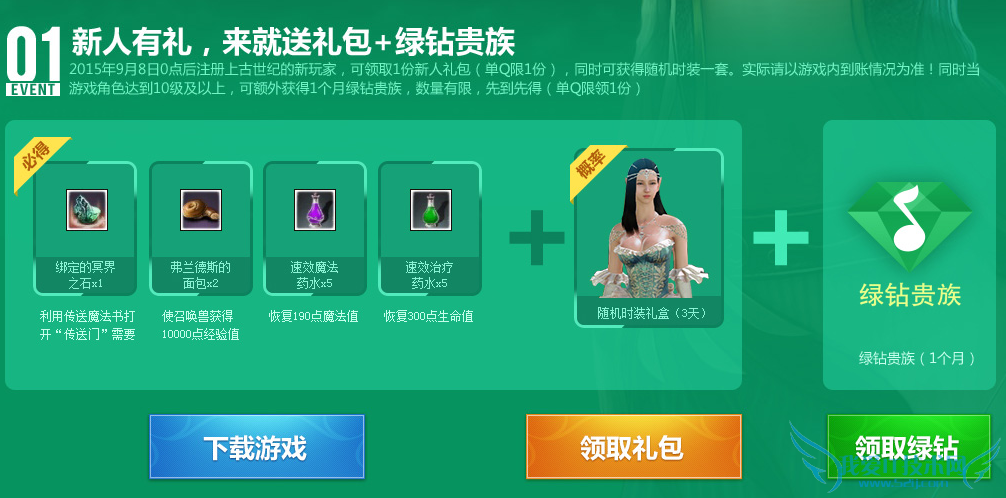 新注册上古世纪的玩家,可领取新手礼包1份,当等级达到10级以上,就可以额外领取1个月绿钻。