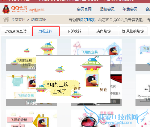 3、先设置上线的动态炫铃,打开上线炫铃界面。选择一款炫铃,将鼠标箭头移到炫铃上可以试听炫铃铃声,在炫铃上点击,进入炫铃设置界面。