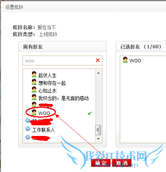 4、选择要对哪些QQ好友设置所选择的动态炫铃,同一款动态炫铃同时只能设置60位好友,选择好友后确定退出设置界面。下线动态炫铃设置与上线动态炫铃设置的步骤类似。