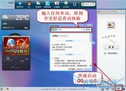 面对文件中某些费解的英语专业术语时,你是否经常为之纠结和郁闷呢?现在,你可以不必再为此烦恼了, WebQQ里提供的QQ云词典就派上用场了。遇到不认识的单词或费解的专业术语时,只需选中该词,QQ云词典的屏幕取词功能会自动带来最新释义。此外,还可以在查词框中输入任意的单词,QQ云词典立刻进行中英互译,让我们享受到便捷快速、精确地查词体验。(图3)