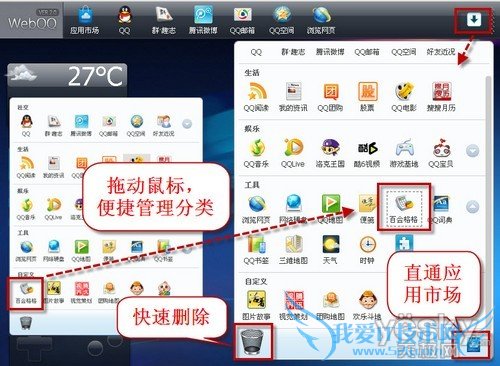 值得一提的是,因为WebQQ应用面板默认APP按不同功能性质进行了分栏设置,甚至还可以根据个人需要进行自定义归类。如果想把"百会格格"划归到工具一栏的话,只需要用鼠标将"百会格格"图表拖拽到工具一栏即可完成;要是你想要将它删除掉的话,只需将其拖拽到垃圾箱后即可快速删除,一键到位,快捷简单。(图2)