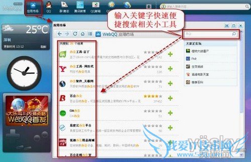 登录WebQQ后,点击左上角的应用市场图标,在弹出的对话框里,根据自身需要添加各类应用;如果快捷菜单里没有需要的应用,在工具搜索栏中输入要查找相关工具或关键字,之后便可搜索到相关工具选项。如输入"办公"关键词点击搜索,便能快速搜索到相关工具。(图1)