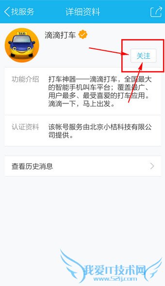 以“滴滴打车”为例,点击进入后选择【关注】