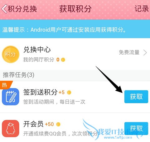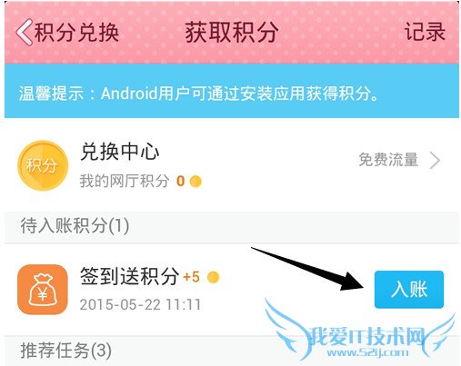 4、获取积分大概分为三种获得方式,每天签到、充值任务、安装应用。最简单的莫过于签到了,点击签到即可完成任务。