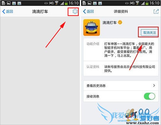 2、点击进入后,点右上角的设置图标,选择取消关注,就可以把广告关闭了。(如下图所示)