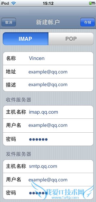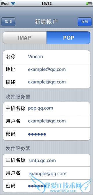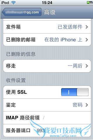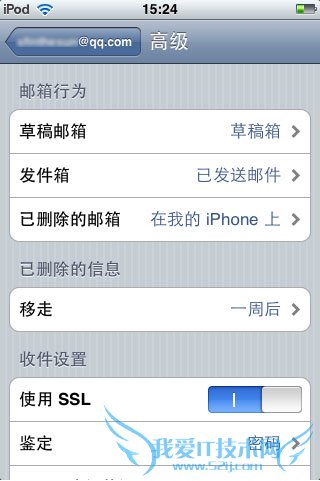 默认情况下,iphone/ipod touch会以POP协议进行收取邮件。POP方式的设置如下所示: