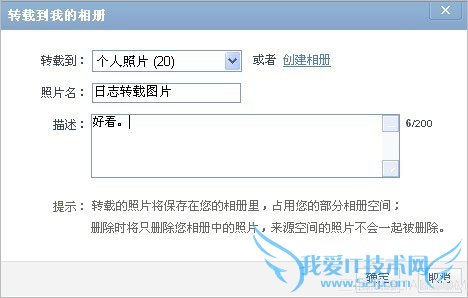 第二步:点击转载按钮会弹出图片转载确认框,框中可选择转载到的相册名(默认:为上次上传/转载的相册)、照片名(默认为:日志转载图片)、照片描述(默认为空)。点击确定后,图片则转载到自己的空间相册内。