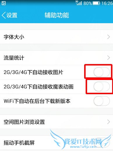 3、进入“辅助功能”,关闭“2G/3G/4G下自动接受图片”以及“2G/3G/4G下自动接受魔表动画”选项;