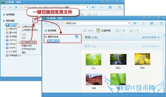 每次出行都要拍几百张照片,张张照片都有美好的回忆,闲时翻看别有一番滋味。可时间久了就发现,管理这些照片成了一件令人头疼的事情:一层层的文件夹结构,让每次打开图片都成为一种考验。QQ影像1.6正式版提供常用的文件夹与“我的电脑”快速切换功能,选择经常使用文件夹右击“设为常用文件夹”,点击切换按钮就可以切换到常用文件夹栏目,结构简单清晰,可快速直达需要的目录文件。(图1)