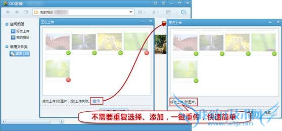 而用户在向QQ空间相册批量上传图片时,可能由于网络和电脑配置等各方面的原因,出现一些图片上传失败的问题,利用QQ影像1.6正式版的空间相册重传功能,不需要重复选择、添加即可一键直接上传,上传靓照更加方便快捷了。(图3)
