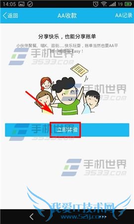 3)点击【AA收款】,刚使用的小伙伴会跳出宣传页面,点击下方【立即体验】。(如下图)