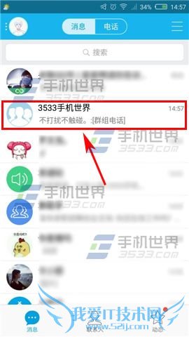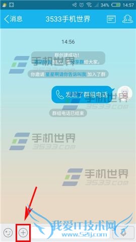 1)打开手机QQ,选择一个【群组】,跳转到会话框页面后,点击【+】按钮。(如下图)