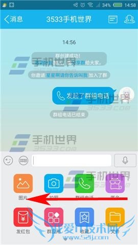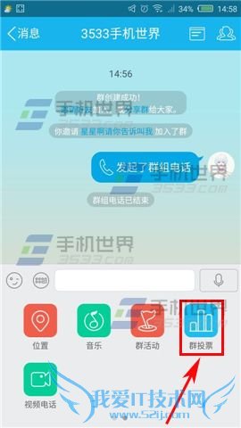 2)弹出选项,用手指向左滑,切换至第二页,点击【群投票】的按钮。(如下图)