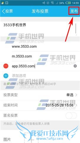 3)接着点击【发起投票】,输入投票主题和选项内容后,点击【发布】即可。(如下图)