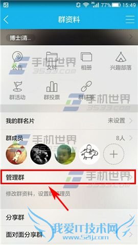 1)打开手机QQ,进入一个群组,点击右上角的【人头像】标志,选择【管理群】;(如下图)