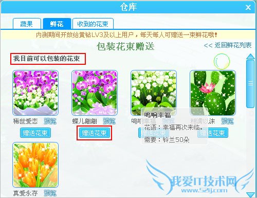 ¡¡¡¡b¡¢Èô²Ö¿âÀïµÄÏÊ»¨×ã¹»£¬½«»áÏÔʾ¿É°ü×°ÄÄЩ»¨Êø£¬½«Êó±ê·ÅÔÚ»¨ÊøÉÏ£¬¼´¿ÉÏÔʾ¸Ã»¨ÊøÐèÒªÄÄЩÏÊ»¨²Å¿ÉÒÔ°ü×°£¬²¢¿É¡°Ô¤ÀÀ¡±»¨Êø£¬µã»÷¡°ÔùËÍ»¨Êø¡±ÔùË͸øºÃÓÑ;Èçͼ£º