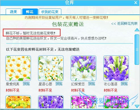 ¡¡¡¡a¡¢ÈôûÓÐ×ã¹»µÄÏÊ»¨°ü×°£¬½«»áÏÔʾ¡°ÏÊ»¨²»¹»£¬ÔÝʱÎÞ·¨°ü×°»¨ÊøÅ¶!¡±£¬´ËʱÄú¿É¸ù¾Ý×Ô¼ºÏ²»¶ÄÄЩ»¨Êø£¬ÔÚÅ©³¡ÖÐÖÖÖ²ÏàÓ¦µÄÏÊ»¨;Èçͼ£º