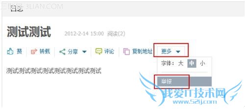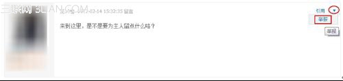 在查看日志评论时,发现评论有不良情况,在该条评论右边回复处点开箭头,再选择“举报”。如图: