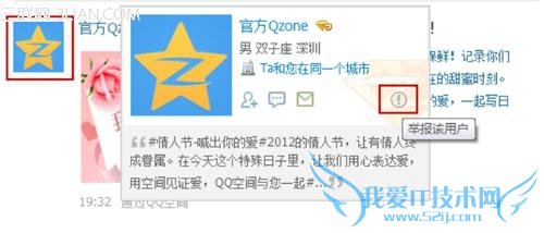 当您看到他人空间头像或空间资料有不良信息,您把鼠标放在对方的空间头像上停留几秒钟,会自动显示个人名片,在个人名片上点击举报按钮。如图: