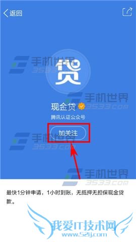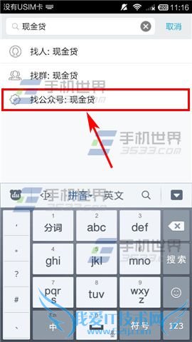 2)输入“现金贷”三个字,在牵引中点击【找公众号】,【加关注】后跳转到会话框页面。(如下图)