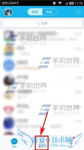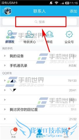 1)打开手机QQ,进入消息页面,点击【联系人】,接着点击上方的【搜索框框】。(如下图)