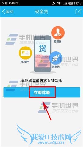 3)点击【借款】按钮,接着点击【立即体验】。(如下图)