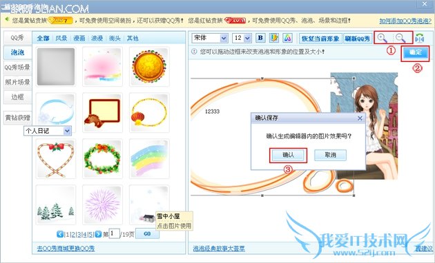 第二步:在“插入QQ秀泡泡”页面,点击编辑框右上的加减号即可放大减小QQ秀泡泡,之后保存即可。如图: