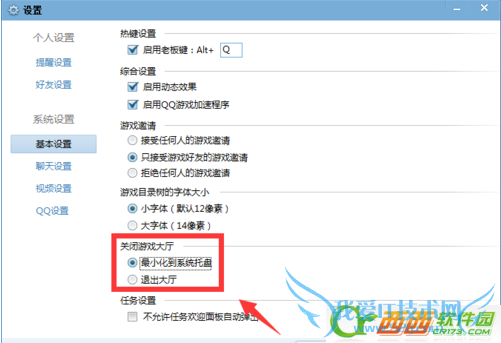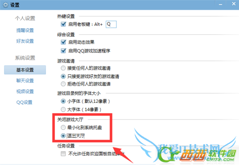 3、在“基本设置”面板将关闭游戏大厅设置有“退出大厅”更改为“最小化系统托盘”
