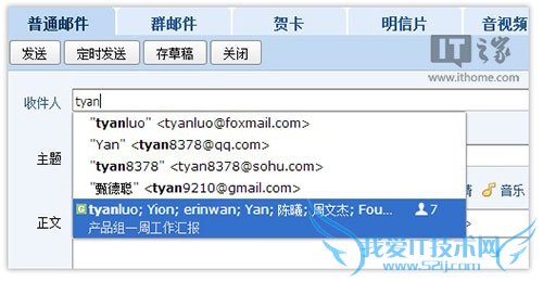 日报、月报、工作周报,你需要经常发信给同一批收件人么?现在,写信时我们帮你自动联想出最近发出邮件中的联系人组,不妨试试用更快捷的方式发邮件。
