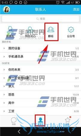 1)打开手机QQ进入应用后点击导航栏【联系人】,接着点击上方三人头像【群组】。接着点击右上角【三】。(如下图)