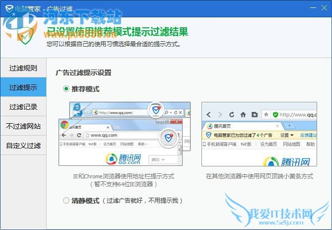 4).除此之外,对于广告过滤工具中可以设置过滤提示,一共有两个选项供大家选择,分为推荐模式、清静模式两种。