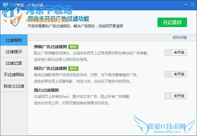 4.这时我们进入了QQ电脑管家广告过滤页面,用户可以点击“开启推荐”或者手工开启。