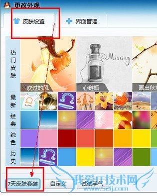 3.在皮肤设置面板中点击左下角的7天皮肤套装按钮,如图: