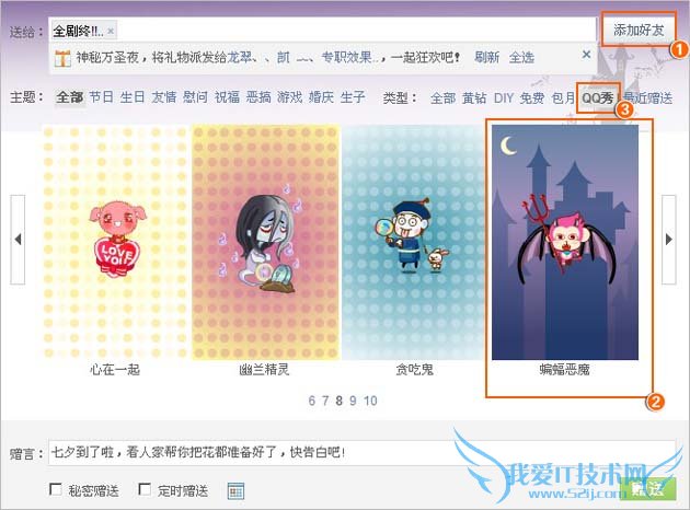 在送礼物页面上,选择“QQ秀”--->选择您需要赠送的QQ秀--->赠送好友的QQ号码--->之后点击确定即可(当您赠送好友QQ秀后,好友会收到相应的提示。您赠送好友的QQ秀,好友可以使用一个月)。