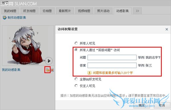2、打开影集后点击右下角“小锁”图标,进入“访问权限设置”,选择“所有人通过回答问题访问”,设置好问题和答案,点击“确定”即可。
