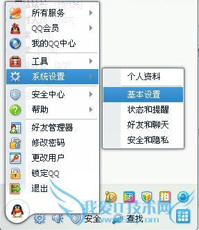 先点QQ主菜单,然后选择:系统设置—— 基本设置,如下图: