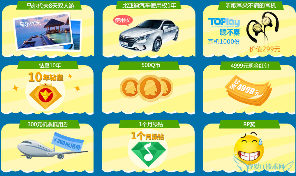 3、参与1Q币抽奖活动的用户可能随机获得马尔代夫8天双人游、比亚迪汽车1年使用权、TOplay听不累耳机、10年钻皇、500Q币、4999元红包、300元财付通旅行机票抵扣券、1个月绿钻等丰富礼品。快来试试你的运气吧;