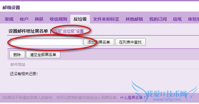 3、然后输入你的要拒收的邮箱地址。点击,返回反垃圾设置