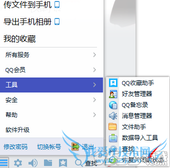 2、在列表中,选择“工具”,然后点击“恢复关闭前状态”。那么关闭前聊得好好的联系人又会自动出现在屏幕上了。
